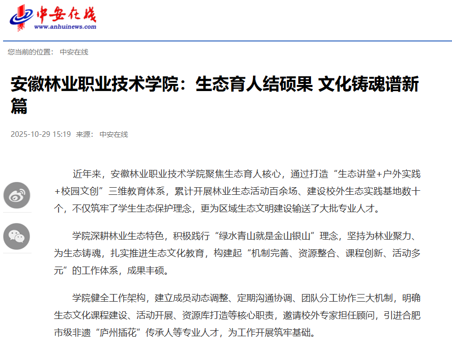 近日,省級(jí)媒體“中安在線”對(duì)我院生態(tài)文化教育工作進(jìn)行了報(bào)道。近年來(lái)...
